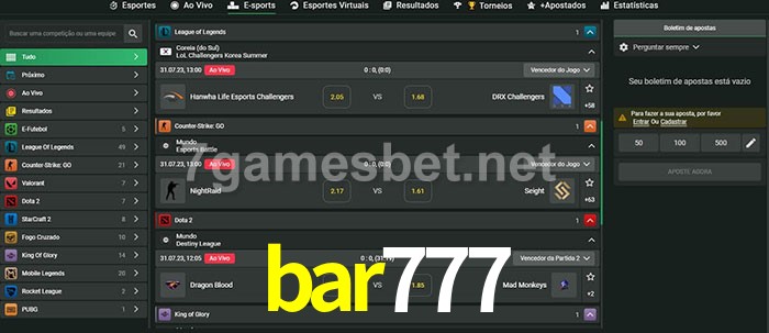O bar777 oferece uma grande seleção de opções de apostas em e-sports com probabilidades competitivas